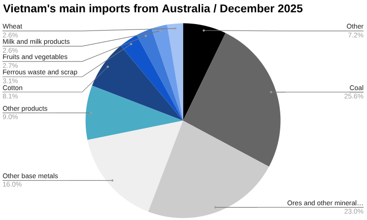 Vietnam imported US$162.89 million worth of ores and other minerals product from Australia in December. This was up from US$54.02 million in November, a change of 201.54 percent.