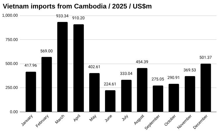 In December, Vietnam imported goods worth US$501.37 million from Cambodia and exported US$507.75 million, bringing total trade to US$1,009.12 million and resulting in a trade surplus of US$6.39 million.