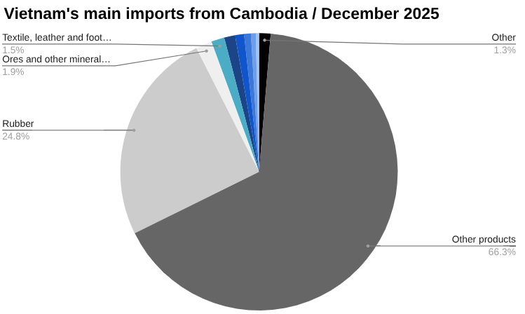 Vietnam imported US$124.98 million worth of rubber from Cambodia in December. This was up from US$98.26 million in November, a change of 27.20 percent.