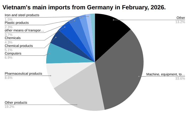 In February, Vietnam imported goods worth US$313.60 million from Germany and exported US$732.89 million, bringing total trade to US$1,046.50 million and resulting in a trade surplus of US$419.29 million.