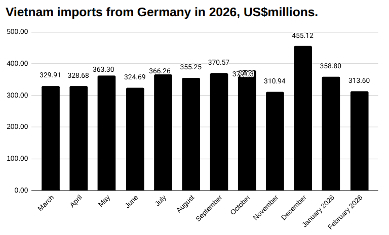 ToggleIn February, Vietnam imported US$313.60 million worth of goods from Germany, down from US$358.80 million in January, a change of -12.60 percent, according to preliminary data from Vietnam’s General Department of Customs.