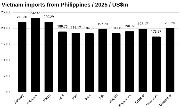 In December, Vietnam imported goods worth US$200.25 million from Philippines and exported US$390.94 million, bringing total trade to US$591.19 million and resulting in a trade surplus of US$190.68 million.
