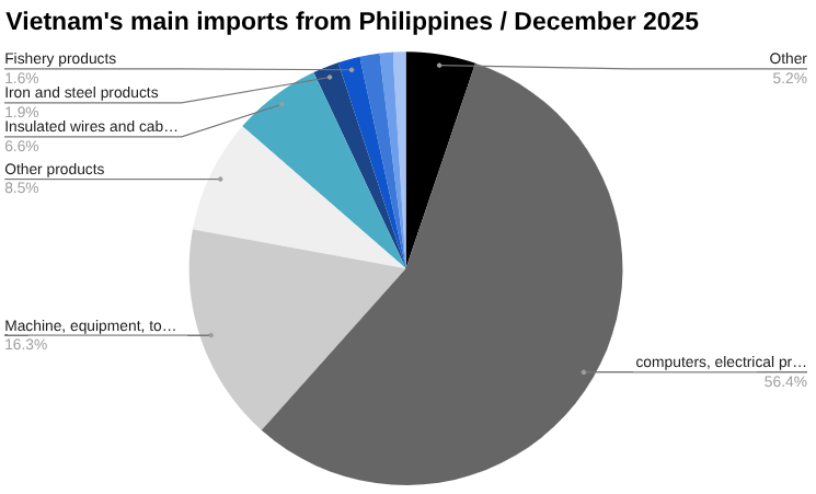 Vietnam imported US$114.06 million worth of computers, electrical products, spare-parts and components thereof from the Philippines in December. This was up from US$108.22 million in November, a change of 5.40 percent.