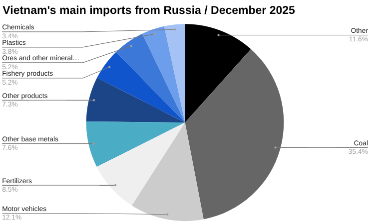 Vietnam imported US$95.54 million worth of coal from Russia in December. This was up from US$63.17 million in November, a change of 51.25 percent.