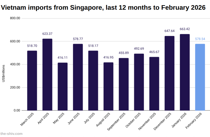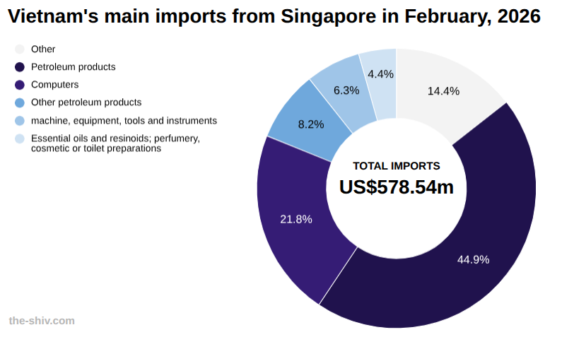 In February, Vietnam imported goods worth US$578.54 million from Singapore and exported US$334.65 million, bringing total trade to US$913.19 million and resulting in a trade deficit of US$243.90 million.