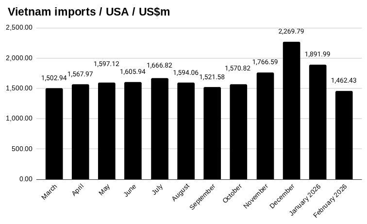 ToggleIn February, Vietnam imported US$1,462.43 million worth of goods from the USA, down from US$1,891.99 million in January, a change of -22.70 percent, according to preliminary data from Vietnam’s General Department of Customs.