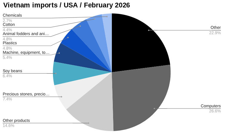 Vietnam imported US$399.80 million worth of computers from the United States in February, down from US$447.98 million in January, a change of -10.76 percent.