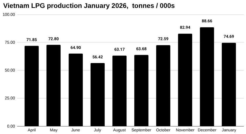 Vietnam produced 74.69 thousand tons of LPG in January, down 15.75 percent from 88.66 thousand tons in December, according to the latest data from the National Statistics Office.