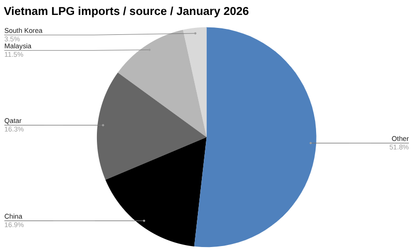China accounted for US$22 million of Vietnam’s LPG imports in January, up from US$19 million in December, an increase of 13.48 percent. Year to date, China has shipped US$22 million of LPG to Vietnam.