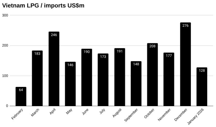 Year to date, Vietnam had imported US$128 million worth of LPG by the end of January.