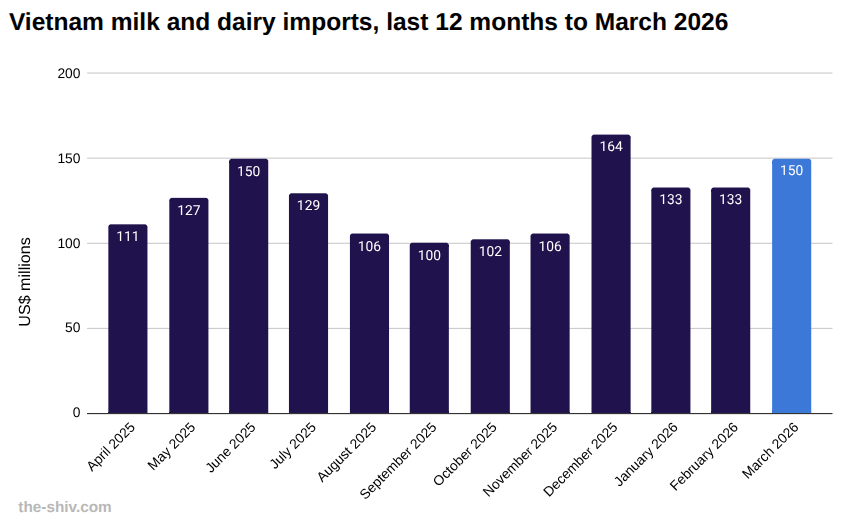 Vietnam imports of milk and dairy in March, 2026 US$m