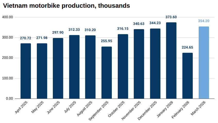 Vietnam produced 354.20 thousand motorbikes in March, up 57.67 percent from 224.65 thousand in February 2026, according to the latest data from the National Statistics Office. Read the full article →