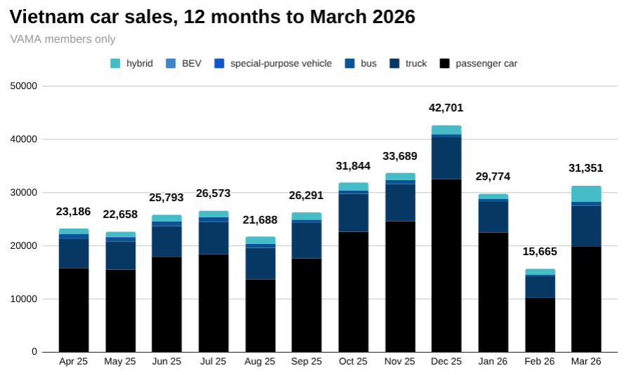 Total car sales in Vietnam reached 31,351 units in March 2026, up from 15,665 in February, according to the latest data from the Vientam Automobile Manufacturers Association (VAMA). Read the full article →