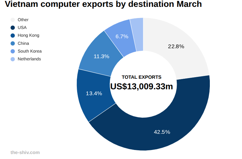 Vietnam exported computers to the tune of US$13,009 million in March, up from US$8,105 million in February, a change of 60.50 percent, according to preliminary data from Vietnam’s General Department of Customs. Read the full article →