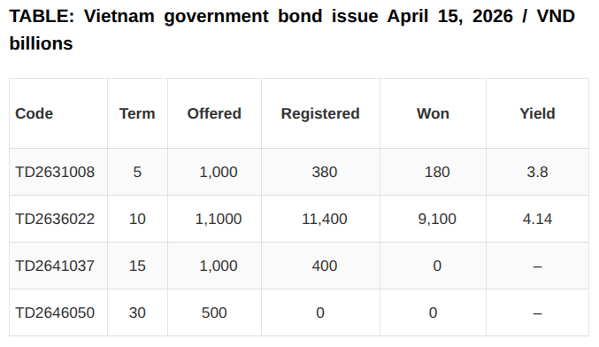 Vietnam’s State Treasury raised VND 9,280 billion (US$352 million) in its April 15 government bond auction, with demand concentrated in the 10-year tenor, according to a release from the Vietnam Bond Market Association. Read the full article →