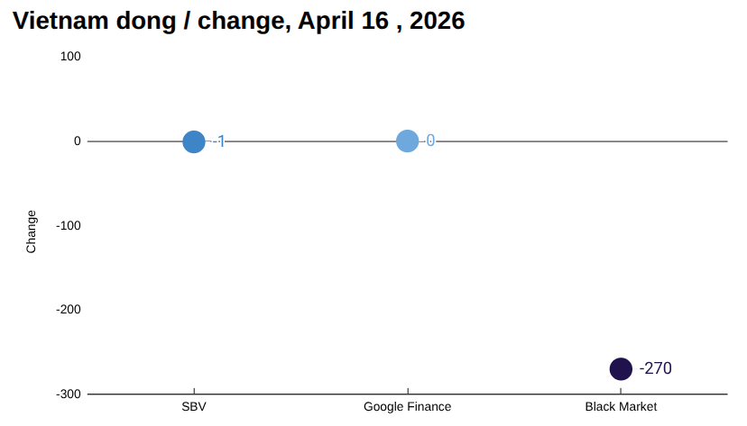 On April 16, in Vietnam, the black market US dollar buy rate was VND 26,600, and the sell rate was VND 26,630, a change of 260 and 280, respectively, for a mid-market rate of VND 26,615 (down 1.00 percent), according to prices quoted by Ty Gia USD. Read the full article →