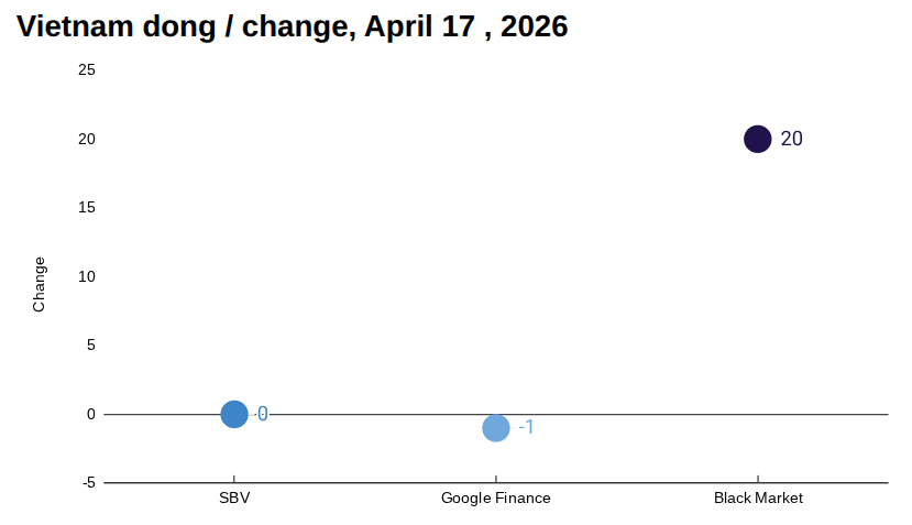 On April 17, in Vietnam, the black market US dollar buy rate was VND 26,610, and the sell rate was VND 26,660, a change of 10 and 30, respectively, for a mid-market rate of VND 26,635 (up 0.08 percent), according to prices quoted by Ty Gia USD. Read the full article →