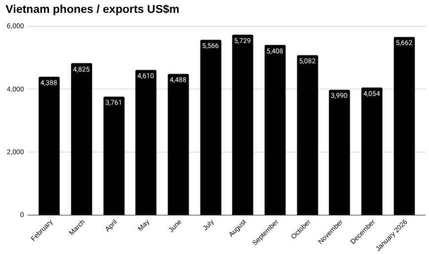 Vietnam exported Phones to the tune of US$5,662 million in January, up from US$4,054 million in December, a change of 39.65 percent, according to preliminary data from Vietnam’s General Department of Customs.