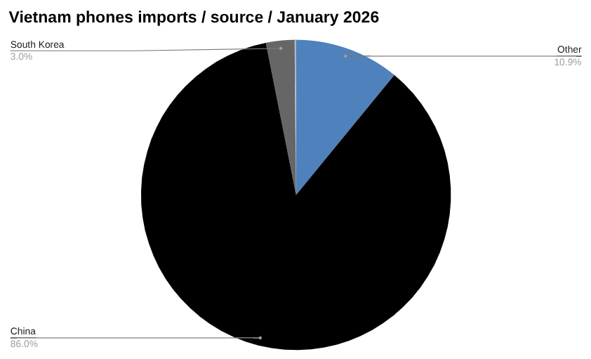 China accounted for US$820 million worth of Vietnam’s phone imports in January. This was down from US$861 million in phone imports in December, a change of 4.78 percent. Year to date, China has shipped US$820 million worth of phones to Vietnam.