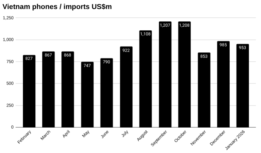 Year to date, Vietnam had imported US$953 million worth of phones by the end of January.