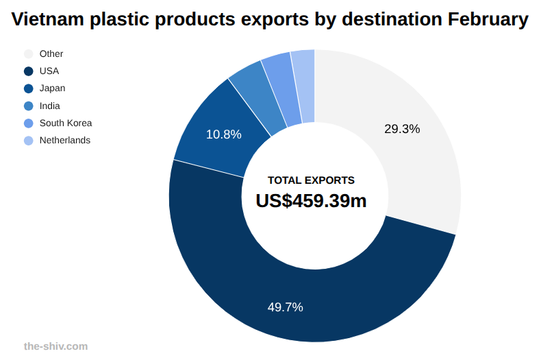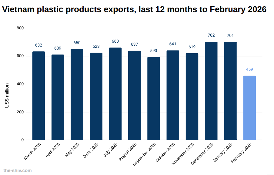 ToggleVietnam exported plastic products to the tune of US$459 million in February, down from US$701 million in January, a change of -34.50 percent, according to preliminary data from Vietnam’s General Department of Customs.