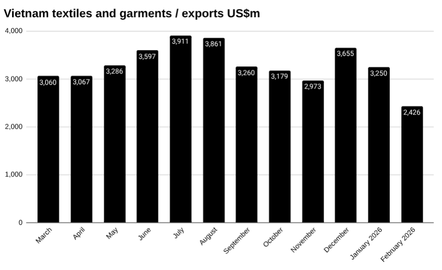 Year to date, textiles and garments exports reached US$5,700 million by the end of February.