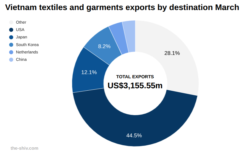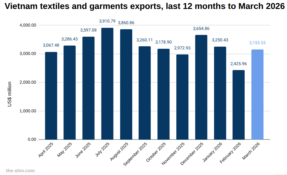 Vietnam exports of textiles and garments in March, 2026 US$m