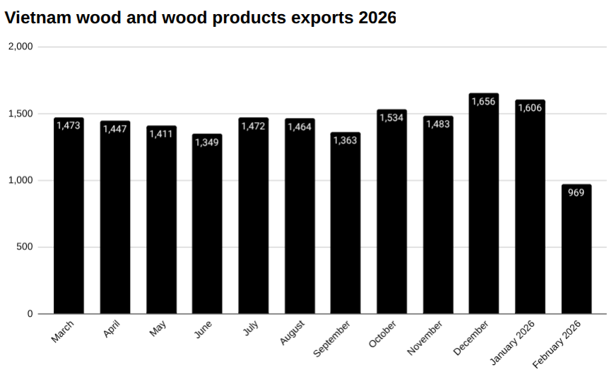 Vietnam exports of wood and wood products in February 2026 US$m