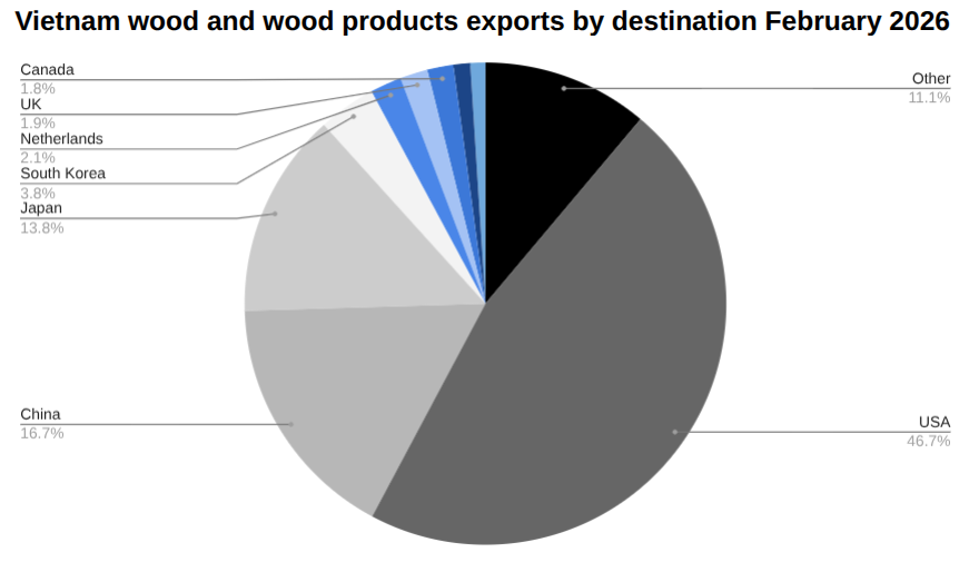The United States accounted for US$452 million of Vietnam’s wood and wood products exports in February, down from US$809 million in January, a change of -44.08 percent. Year to date, exports to the United States reached US$1,261 million.