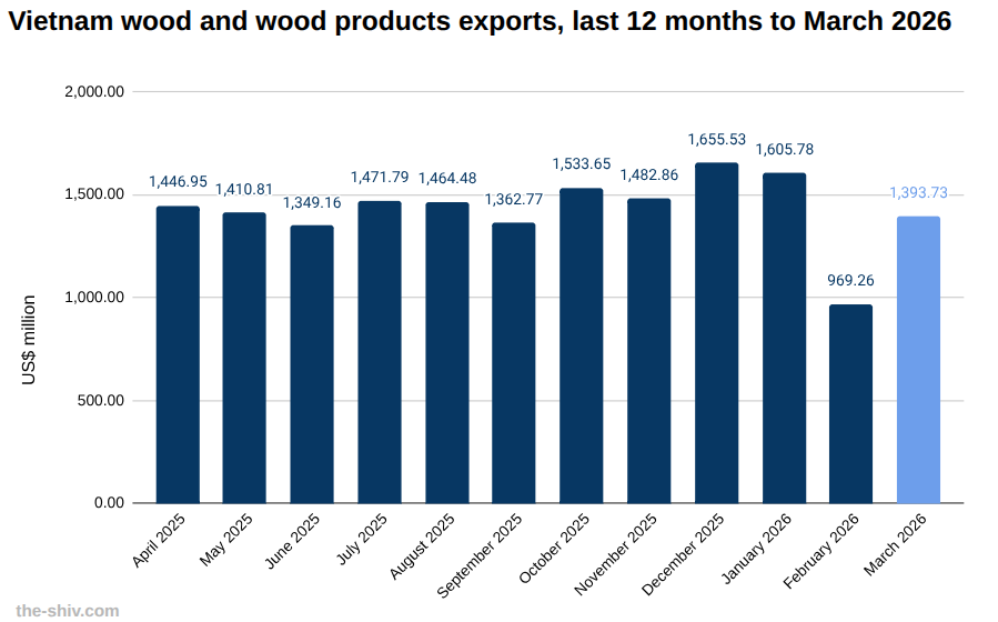 Vietnam exports of wood and wood products in March, 2026 US$m