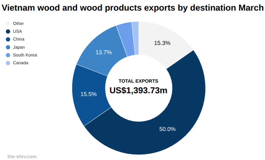 ToggleVietnam exported wood and wood products to the tune of US$1,394 million in March, up from US$969 million in February, a change of 43.79 percent, according to preliminary data from Vietnam’s General Department of Customs.