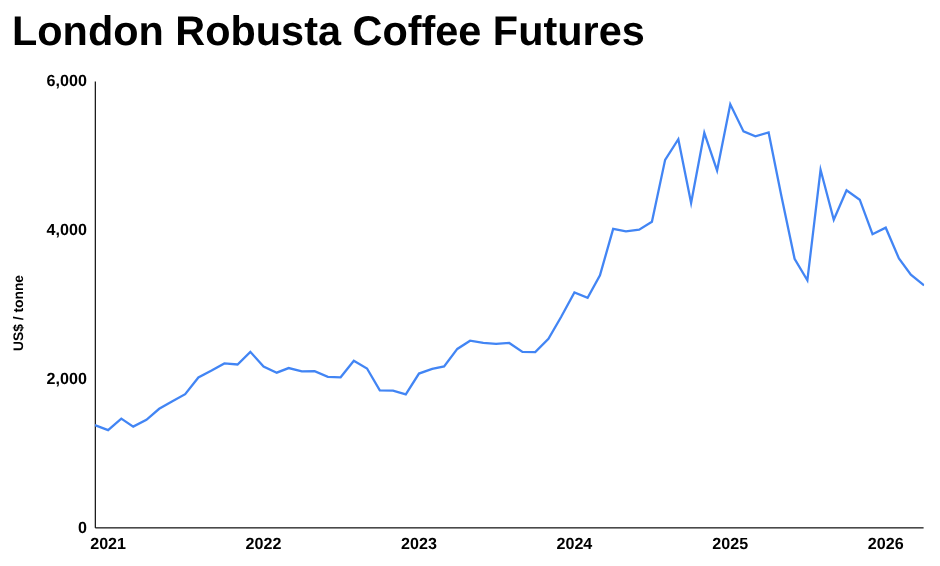 Indeed, a tonne of coffee on the London exchange averaged roughly US$2,087 a tonne over the 2020 to 2023 period, but then more than doubled to US$4,204 in 2024, followed by US$4,573 in 2025.