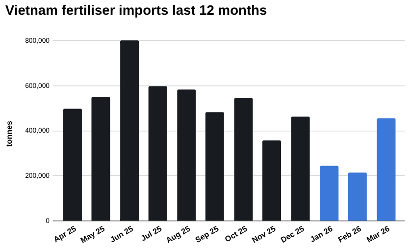 Of note, Vietnam’s fertiliser imports by tonnage more than doubled in March over February, with the bulk of said imports coming from China — roughly 46 percent. China, however, it was reported last month, looks set to restrict fertiliser exports, which could push up local prices even further — or, in the event of a supply crunch, could see yields fall.