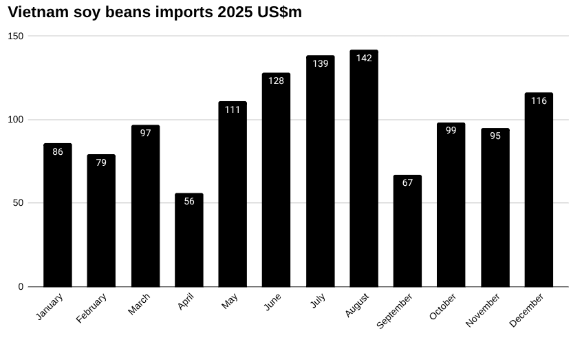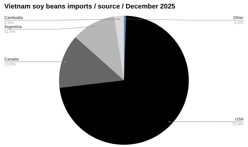 Next was Argentina contributing US$13 million worth of Vietnam’s soy beans imports in December. Year to date, Argentina has shipped US$23 million worth of soy beans to Vietnam.