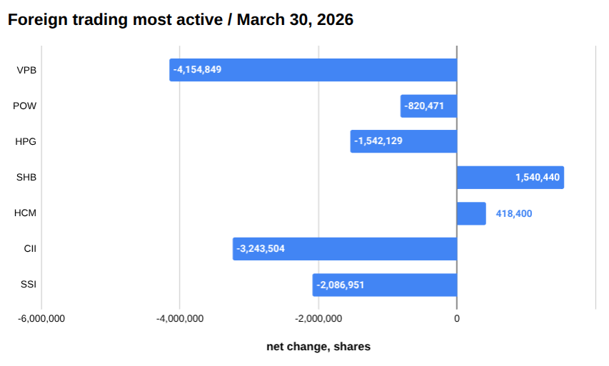 VPB topped foreign selling activity with 3,367,151 shares sold. The stock climbed 1.75 percent to VND 26,100.