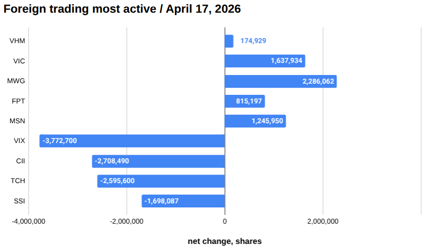 VHM topped foreign selling activity with 5,177,710 shares sold. The stock fell 6.15 percent to VND 135,700.