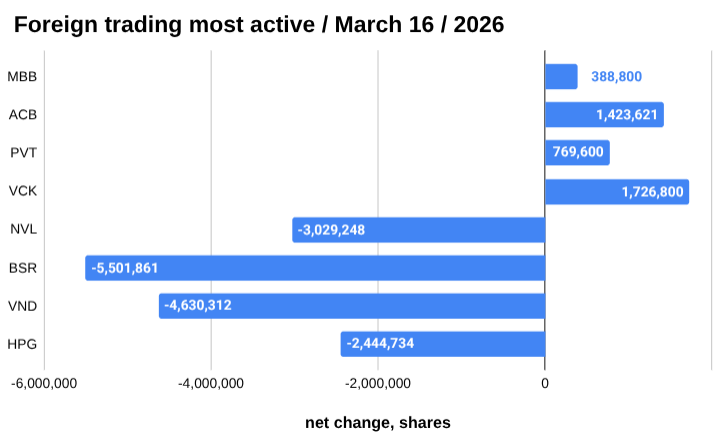 NVL topped foreign selling activity with 5,171,100 shares sold. The stock climbed 0.75 percent to VND 13,500.