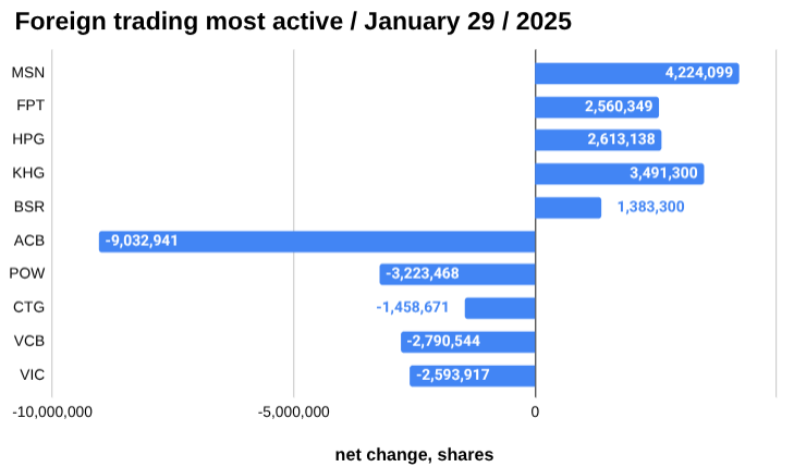 MSN topped foreign buying with 6,445,401 shares bought. The stock climbed 4.73 percent to VND 84,100.