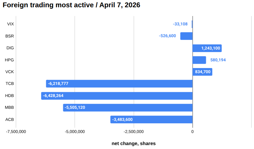 TCB topped foreign selling activity with 1,076,823 shares sold. The stock fell 1.88 percent to VND 28,700.