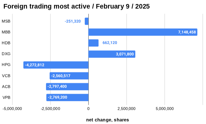 MSB topped foreign selling activity with 65,532,500 shares sold. The stock fell 1.25 percent to VND 11,850.
